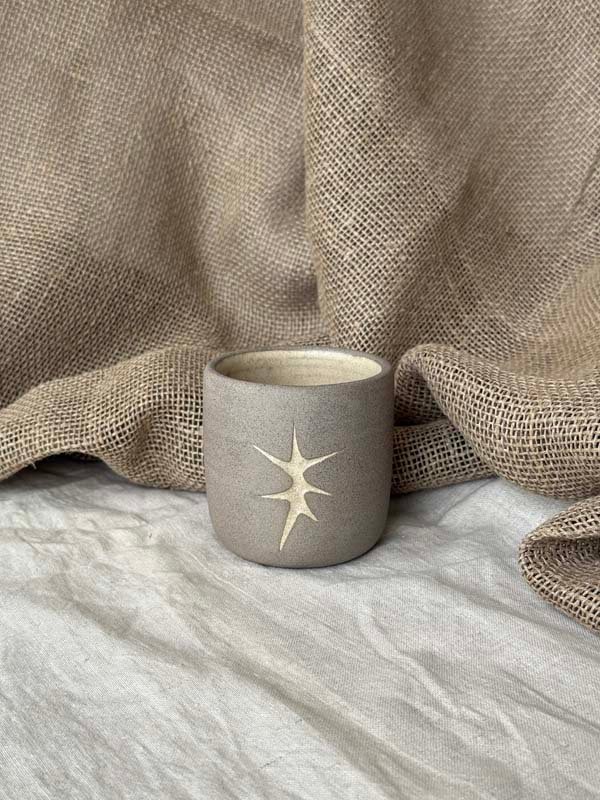 stoneware cup – glazed on the inside and in the carvings; raw clay on the outside