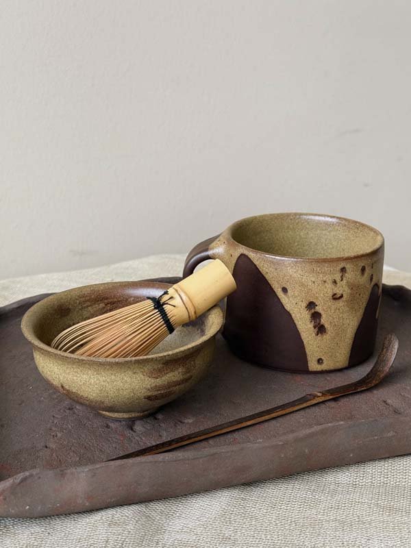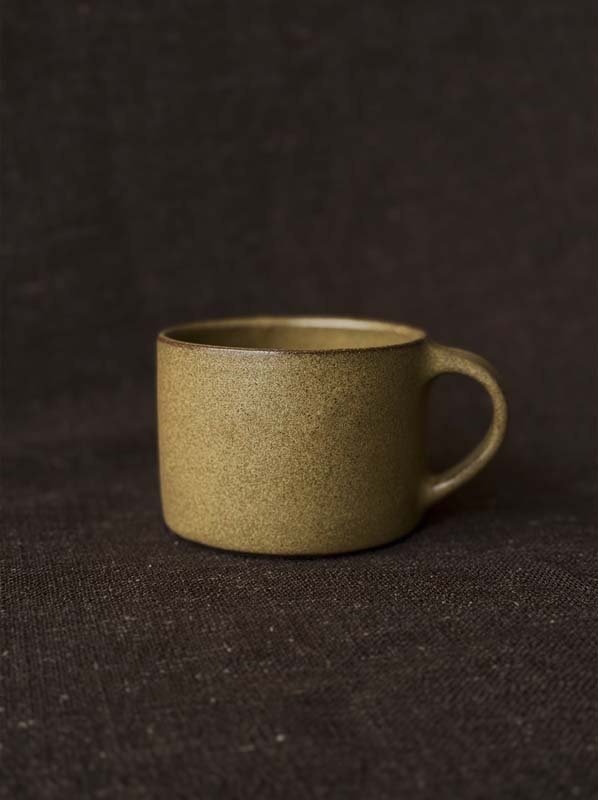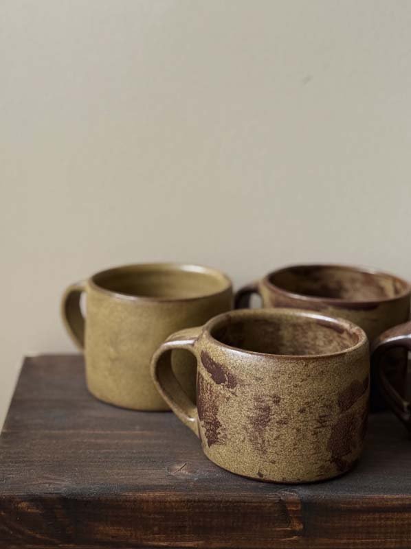 wheel-thrown stoneware mugs, glazed with earthy satin glazes